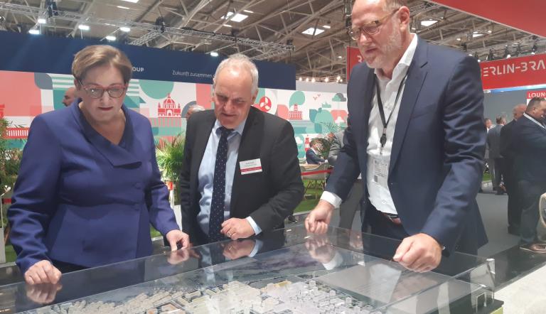 Der Bau- und Wirtschaftsbeigeordnete Bernd Rubelt, eine Delegation der Wirtschaftsförderung sowie Bert Nicke, Geschäftsführer der ProPotsdam GmbH, stellten aktuelle Entwicklungen und Angebote vor und tauschten sich mit Interessenten, Projektentwicklern und Investoren aus. Zu den Höhepunkten der Potsdamer Teilnahme zählte eine Podiumsdiskussion über das Bauprojekt für das neue Quartier Krampnitz und ein Austausch mit Bundesministerin Klara Geywitz. Im Anschluss an eine Keynote der Ministerin zur aktuellen Lage der Immobilienwirtschaft, insbesondere in der Metropolregion und den Maßnahmen des Ministeriums, nahm sich die Ministerin Zeit, sich das interaktive Modell zum Bauvorhaben in Krampnitz anzusehen.