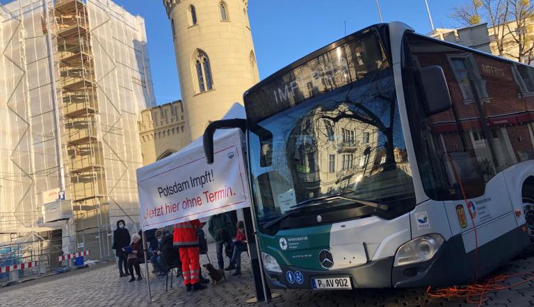Erster Stopp des neuen Impf-Busses der Landeshauptstadt: Am Samstag hat die Beigeordnete für Ordnung, Sicherheit, Gesundheit und Soziales, Brigitte Meier, das neue Impf-Angebot in Potsdam offiziell eröffnet. Erster Stopp des Busses war am Nauener Tor. In den kommenden Wochen wird der in Zusammenarbeit mit dem Verkehrsbetrieb Potsdam GmbH umgebaute Linienbus drei Mal wöchentlich an verschiedenen Standorten in der Stadt halten und Impfungen vor der Haustür anbieten. „Wir erweitern mit dem Impf-Bus das kommunale Impfangebot. Im Bus können sich alle ab zwölf Jahre spontan und ohne Termin impfen lassen. Damit sind nun Impfungen bei Ärztinnen und Ärzten, in teilnehmenden Apotheken, in den beiden kommunalen Impfstellen Schinkelhalle und Metropolishalle sowie im Impfbus möglich“, sagte Brigitte Meier. Der Bus wird in Zusammenarbeit mit dem DRK Landesverband Brandenburg betrieben.