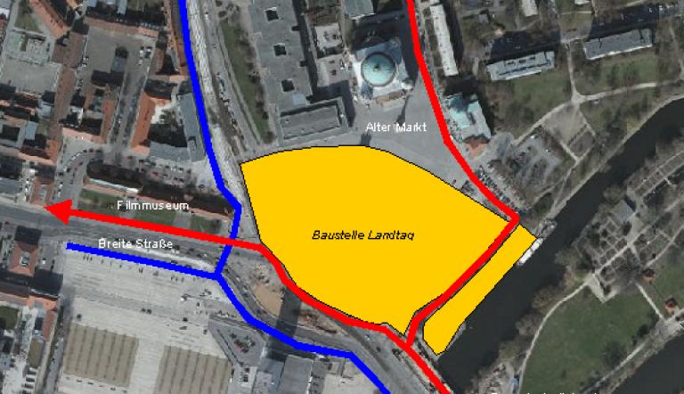In der Zeit der Bauarbeiten für den neuen Fußgängertunnel unter der Langen Brücke wird es für die Radfahrer unterschiedliche Verkehrsführungen in Richtung Hauptbahnhof/Leipziger Dreieck geben. Zunächst wird der Radverkehr aus Richtung Breite Straße bzw. Friedrich-Ebert-Straße über einen Radfahr- bzw. Schutzstreifen zusammen mit dem Kfz-Verkehr auf die Lange Brücke geführt. Wer diese Engstelle umfahren will, kann dies über den Alten Markt und dann den Radweg entlang der Gleistrasse, der für Radverkehr in beiden Richtungen freigegeben ist. Der Weg zwischen Gleistrasse und Landtagsbaustelle ist in Richtung Hauptbahnhof nicht für Radfahrer freigegeben!In der Gegenrichtung beeinträchtigt die Baustelle des Landtags noch bis voraussichtlich 2013 den Radverkehr. Durch den massiven Bauzaun bestehen Sichtbeeinträchtigungen und es besteht baustellenbedingt ein enger Verkehrsraum für Fußgänger und Radfahrer. Bitte nehmen Sie hier besonders Rücksicht! Um diese Engstelle zu entlasten, wird für alle Radfahrer in Richtung Zentrum/Friedrich-Ebert-Straße empfohlen, über den Alten Markt und die Humboldtstraße zum Platz der Einheit und von dort zur Friedrich-Ebert-Straße auszuweichen. Dies sind nur wenige Meter Umweg, dafür ist hier mit weniger Behinderungen zu rechnen. Zur Breiten Straße kommt man weiter über die Strecke zwischen Baustelle und Gleistrasse.