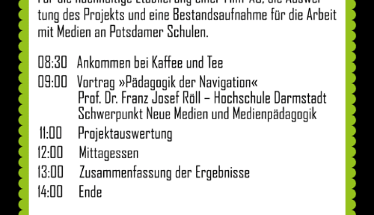 Für die nachhaltige Etablierung einer Film-AG, die Auswertung des Projektes und eine Bestandsaufnahme für die Arbeit mit Medien n Potsdamer Schulen.