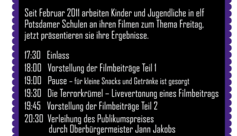 Seit Februar 2011 arbeiten Kinder und Jugendliche in elf Potsdamer Schulen an ihren Filmen zum Thema FREITAG. Jetzt präsentieren sie ihre Ergebnisse.