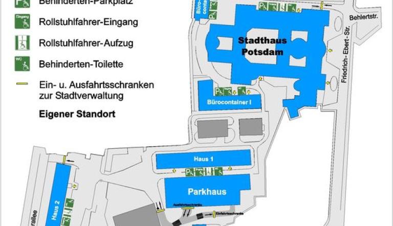 Kostenpflichtige Parkplätze befinden sind im Parkhaus auf dem Gelände der Landeshauptstadt Potsdam. (Einfahrt Hegelallee)