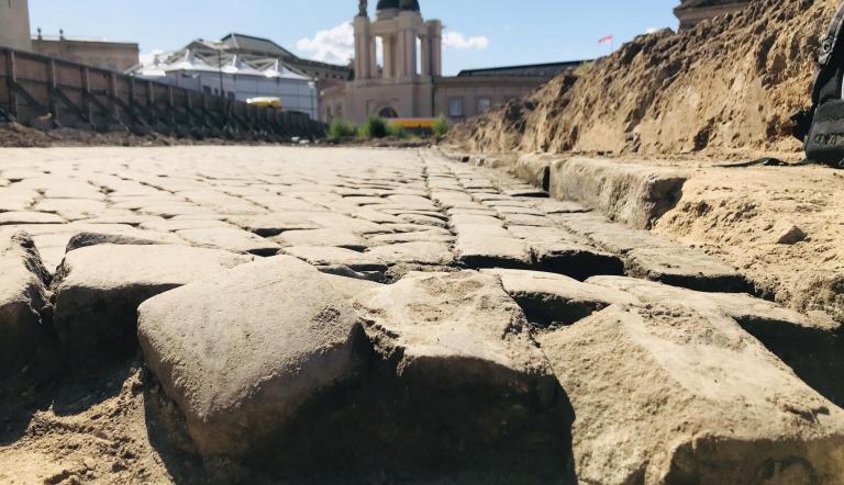 Historischer Fund in der Potsdamer Mitte: Bei den Bauvorbereitungsmaßnahmen des Sanierungsträgers Potsdam am Alten Markt, auf dem Areal der ehemaligen Fachhochschule Potsdam, ist ein historisches Straßenpflaster aus dem 19. Jahrhundert entdeckt worden. Es wird der ehemaligen Kaiserstraße zugeordnet. Das Pflaster läuft direkt auf das Foruna-Portal auf dem Alten Markt zu.